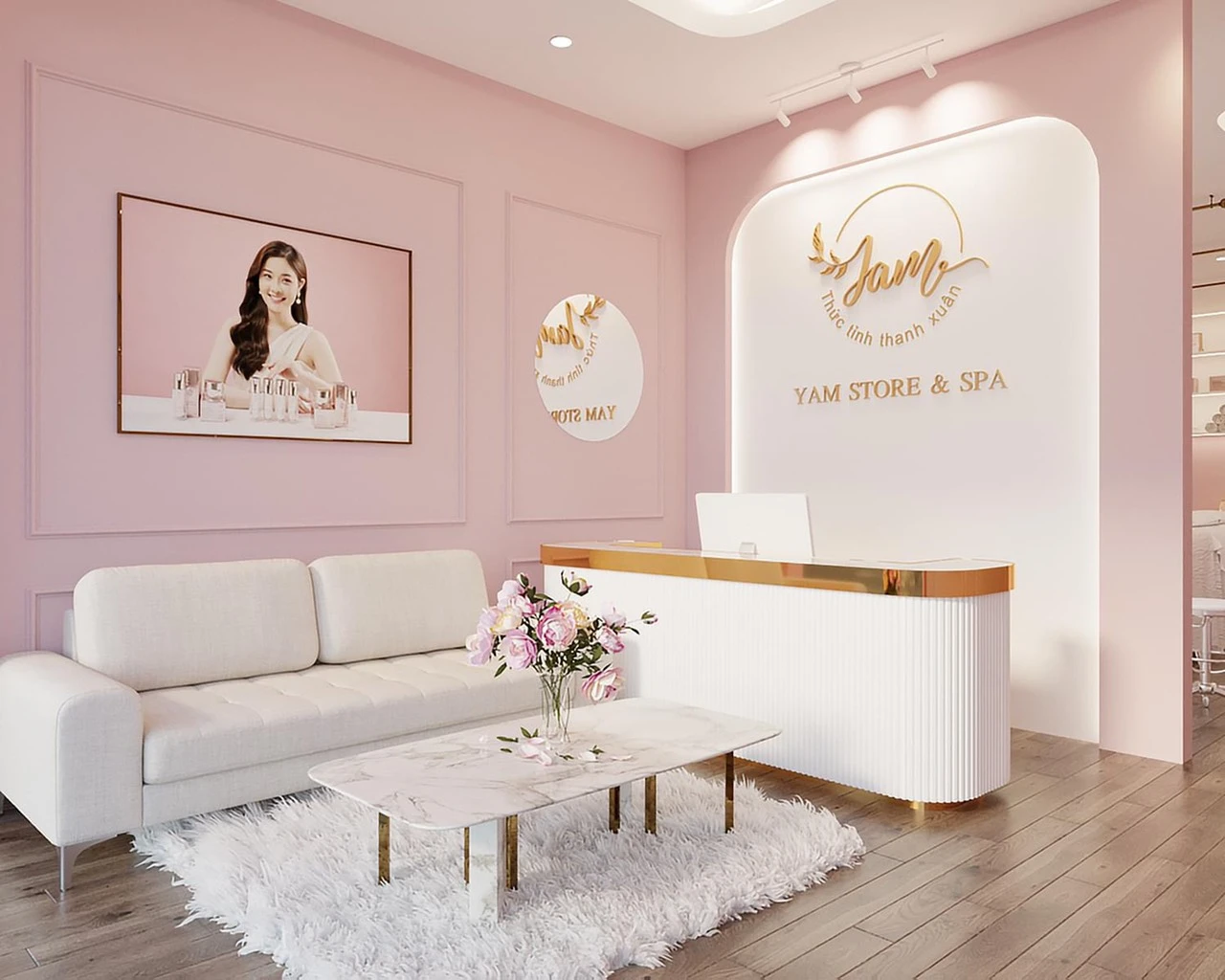Phía sau quầy là tấm vách ốp gỗ có logo của spa kèm slogan thương hiệu, kết hợp với hệ thống đèn LED viền, đèn rọi làm nổi bật và gây ấn tượng hơn với khách hàng. Đặc biệt, quầy được bố trí đối diện cửa ra vào để nhận thêm ánh sáng tự nhiên