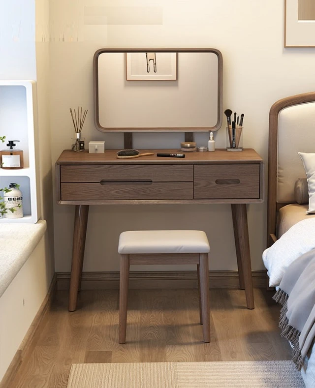 - Kích thước bàn trang điểm cho phòng diện tích nhỏ: Chiều rộng 70 – 90cm, chiều cao 60 – 85cm, chiều sâu 30 – 35cm.
